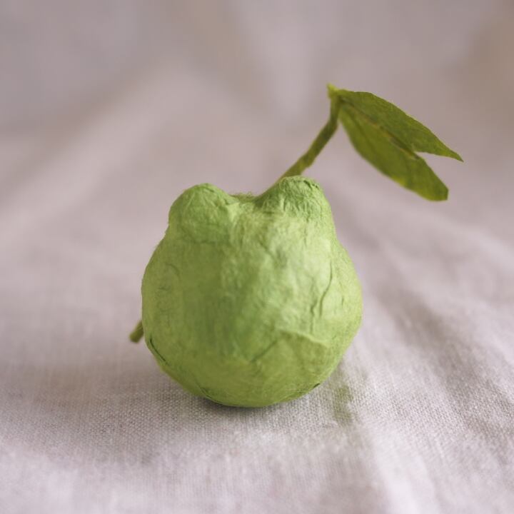 和紙で作った、葉っぱの傘をもったカエルの張り子人形です。